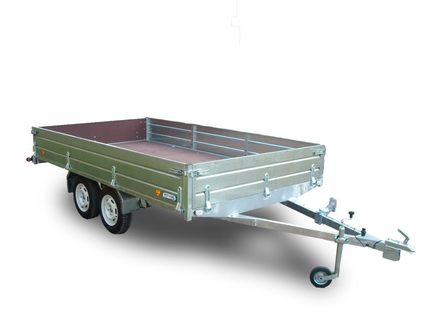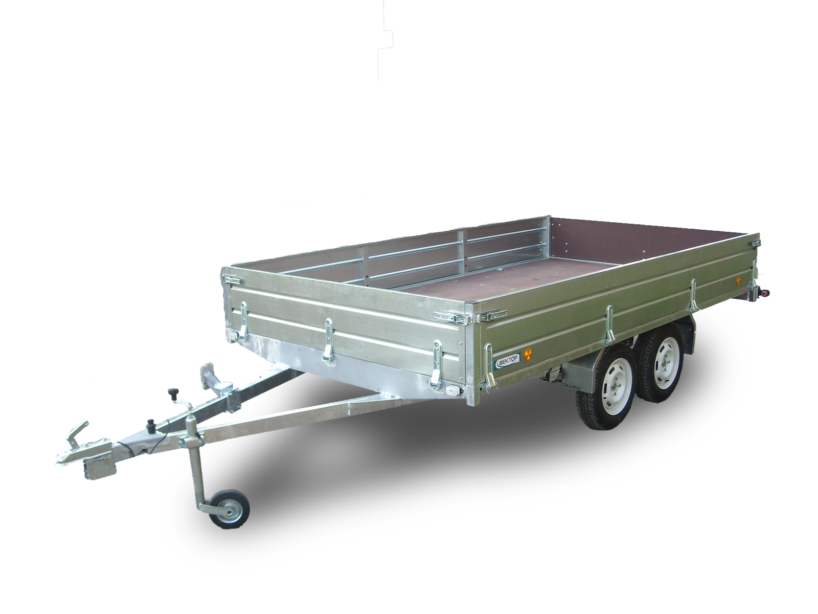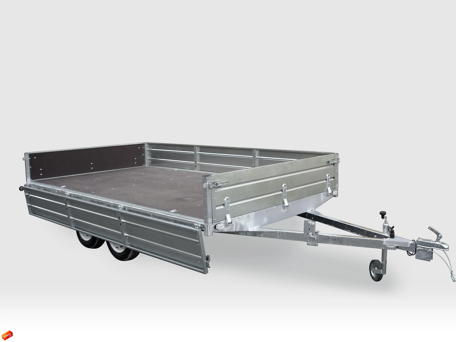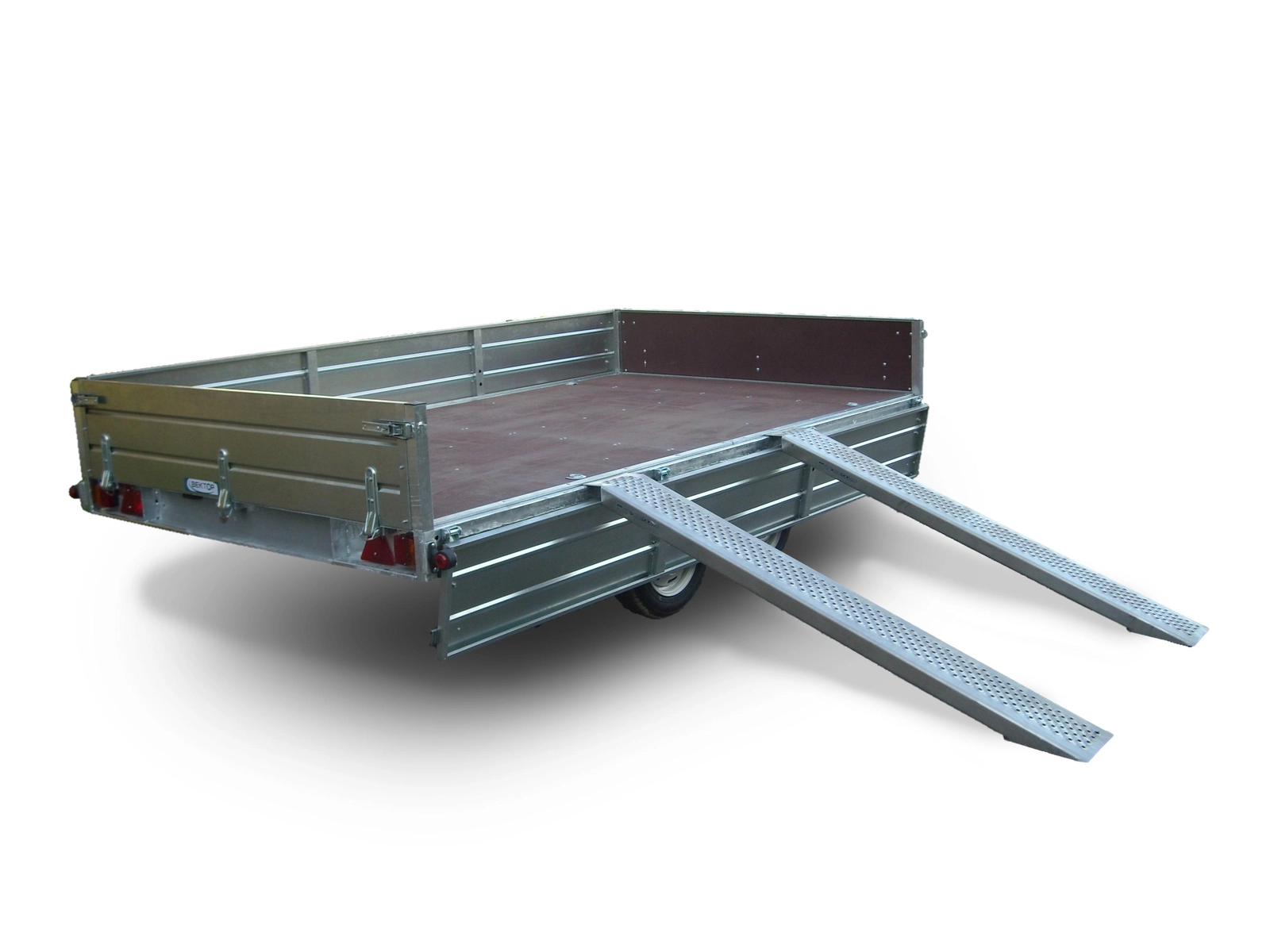 Размеры кузова 3555*2260 мм позволяют перевозить два снегохода или два квадроцикла одновременно. Передний, задний и продольные борта откидываются на петлях, что позволяет производить погрузку-выгрузку с любой стороны прицепа. Возможность быстрого демонтажа бортов позволяет превратить бортовой прицеп в грузовую платформу.