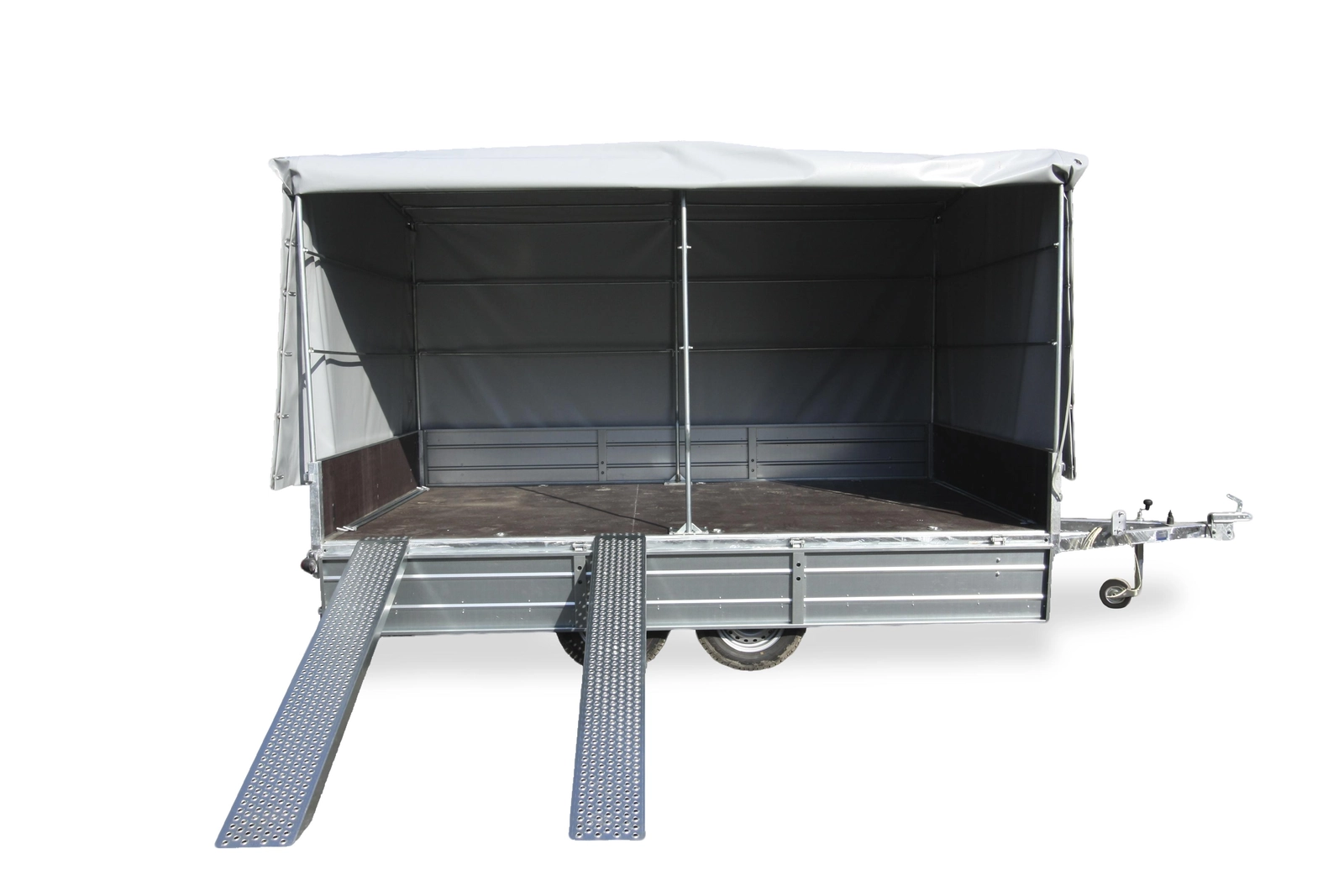 Тент с каркасом,трапы для заезда г/п 800 кг, запасное колесо, задний борт-трап. Комплектование прицепа задним борт-трапом возможно только при высоте бортов 380 мм. Не требуется категория "Е"