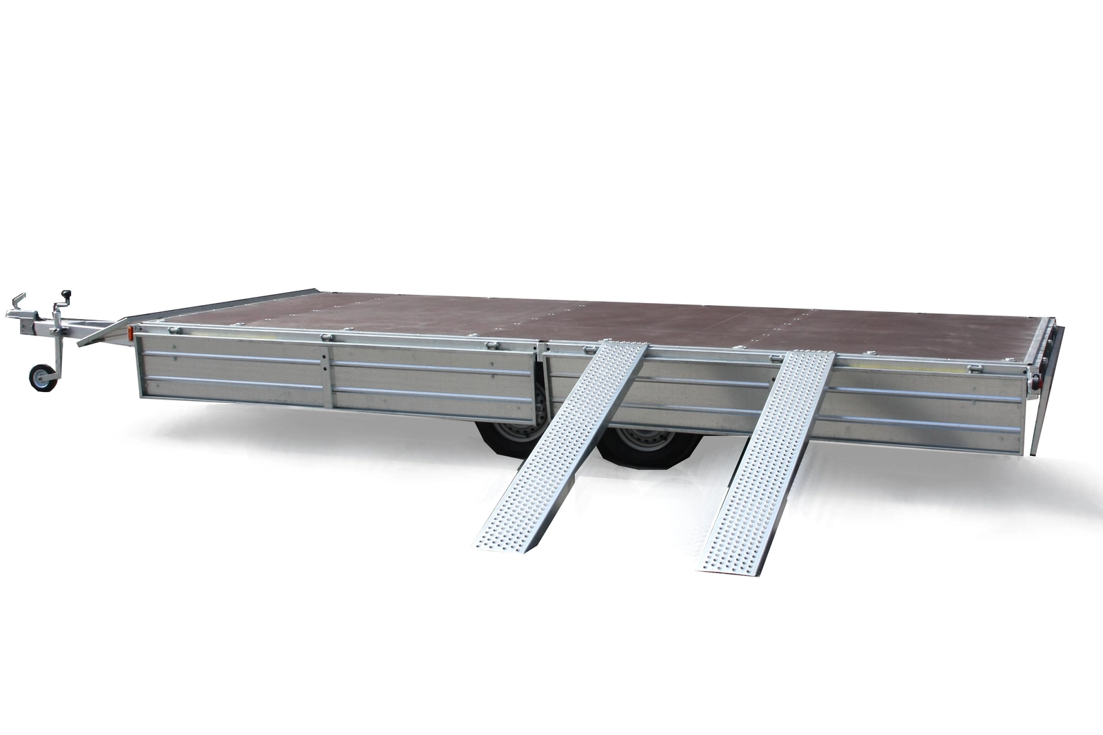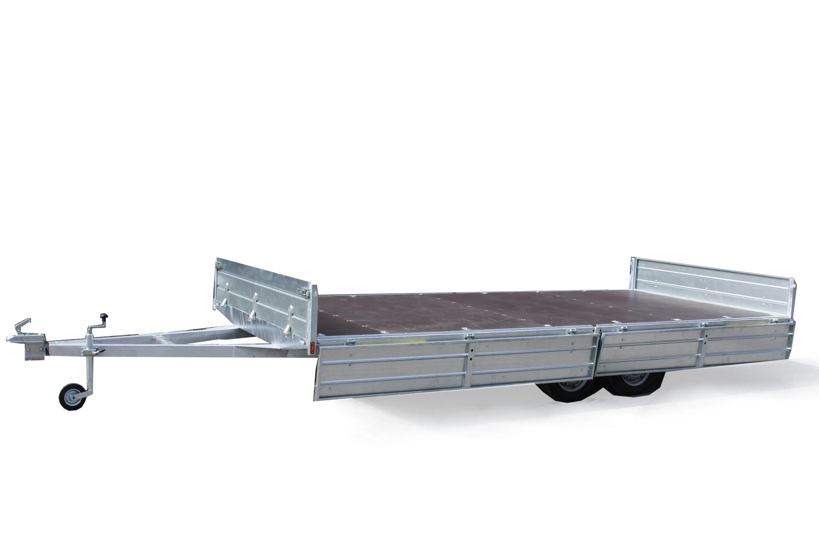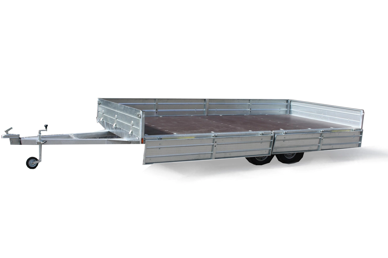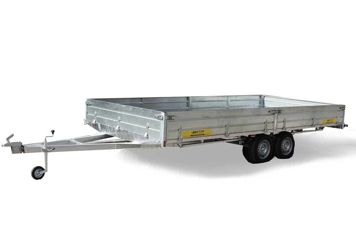 Размеры кузова 5105*2350 мм позволяют перевозить несколько единиц техники или длинномерные грузы. Передний, задний и продольные борта откидывающиеся на петлях, это позволяет производить погрузку-выгрузку с любой стороны прицепа. Возможность быстрого демонтажа бортов позволяет превратить бортовой прицеп в грузовую платформу. Предназначен для перевозки мототехники, квадроциклов снегоходов, и других грузов, по всем видам дорог, на которых допускается эксплуатация легковых автомобилей. Рама, дышло и ось прицепа полностью оцинкованные методом горячего цинкования изнутри и снаружи. Борта из оцинкованной стали. Дышло V-образное. Днище - ламинированная фанера. Подвеска колес (R14) на четырёх полуэллиптических переменного сечения рессорах с гидравлическими амортизаторами. Кузов не откидывается. Высота бортов 380 мм. Грузоподъёмность 158 кг, фактическая 800 кг.