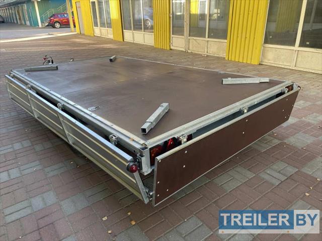 Опорное колесо, регулятор высоты сцепного устройства и кронштейн для "запаски" в стандартной комплектации. Опции: Тент с каркасом, трапы для заезда г/п 800 кг, запасное колесо,