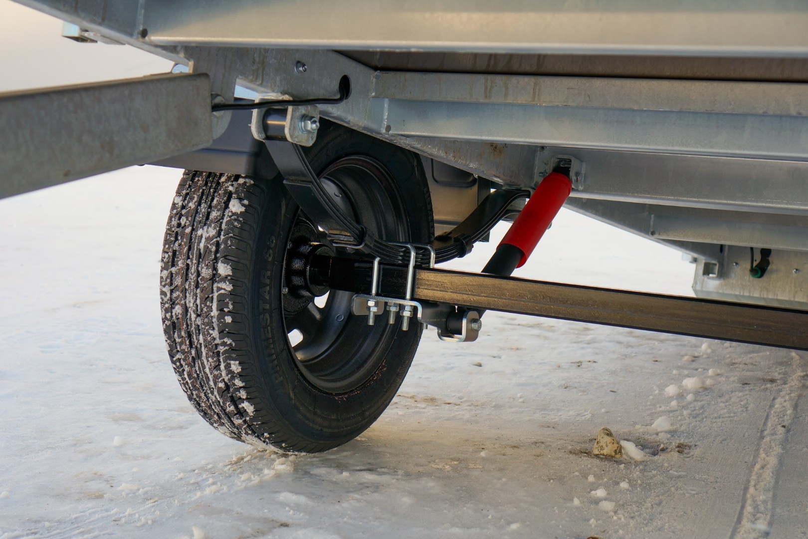 двумя самосвальными усиленными замками-защелками с R-образными шплинтами и регулировкой натяжения с максимальной нагрузкой до 700кг. Развесовка прицепа позволяет использовать самосвальный режим без применения дополнительных упоров или домкратов;