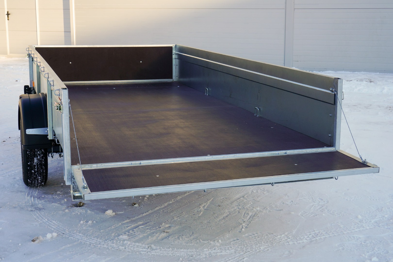 Днище прицепа изготовлено из транспортной влагостойкой ламинированной фанеры 9 мм с сетчатым противоскользящим покрытием. Фанера утоплена в один уровень с передним и задним бампером.