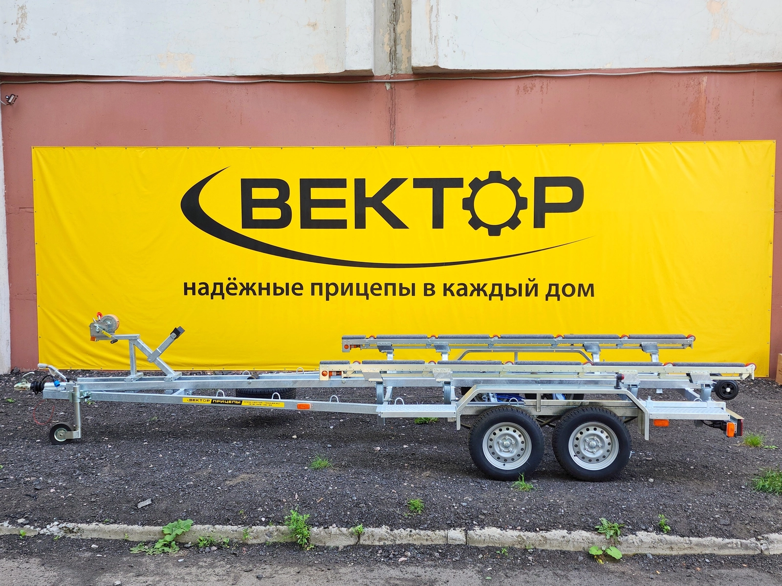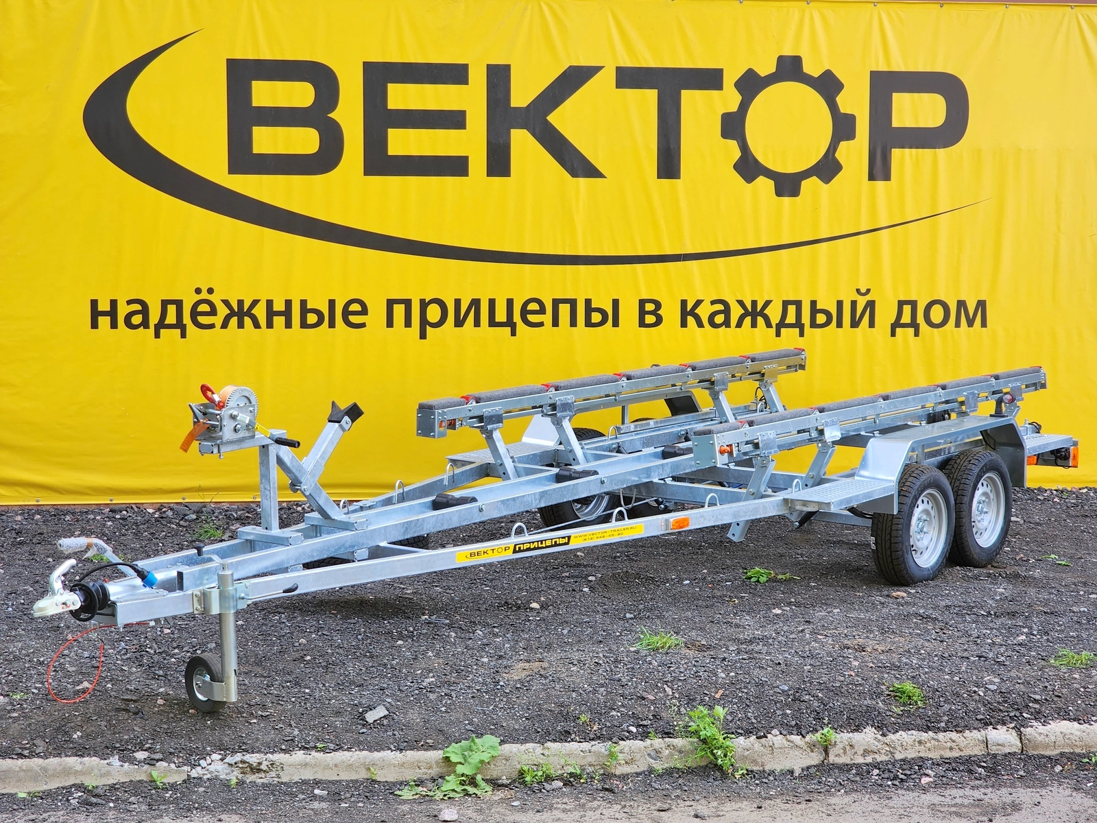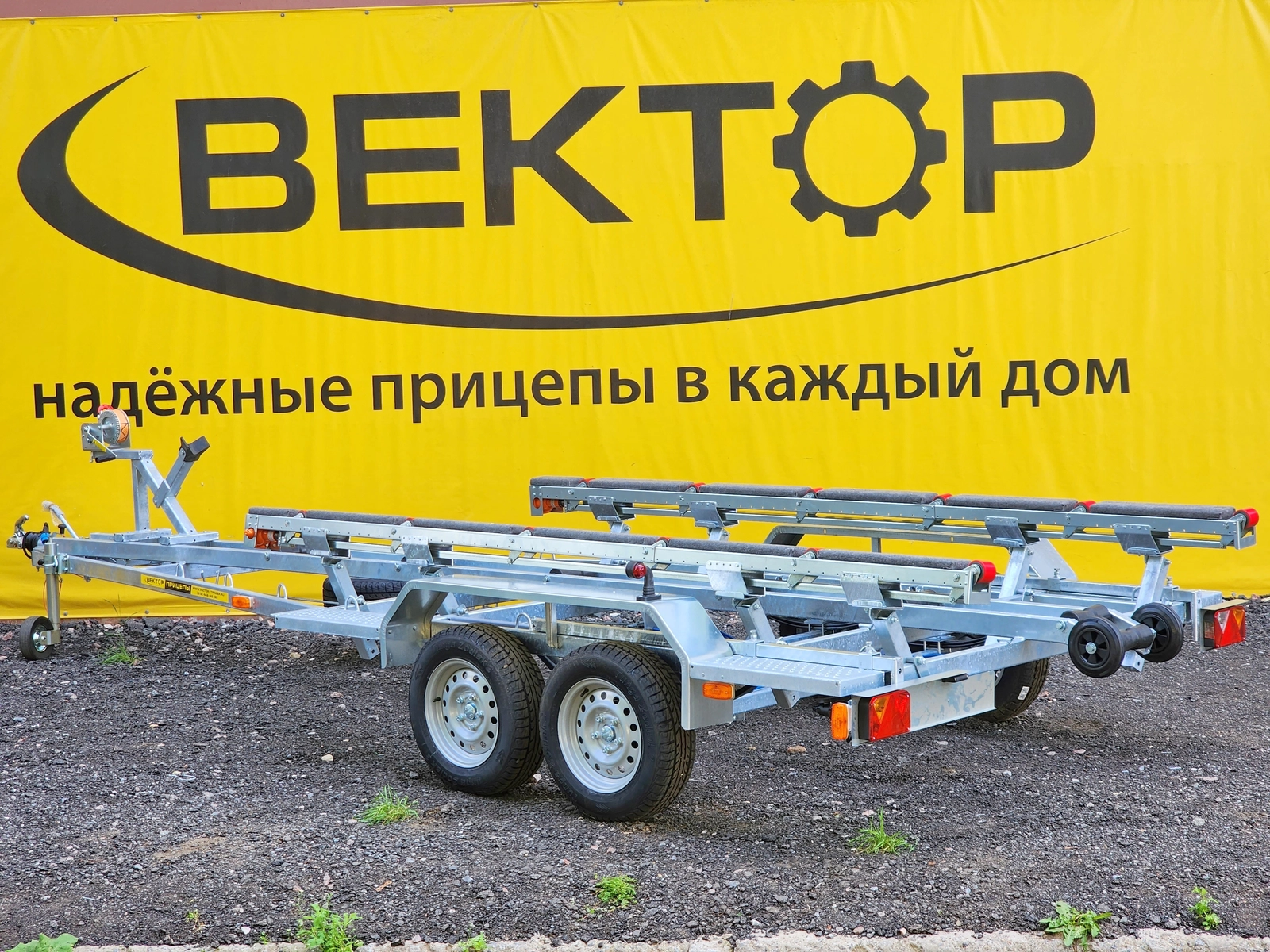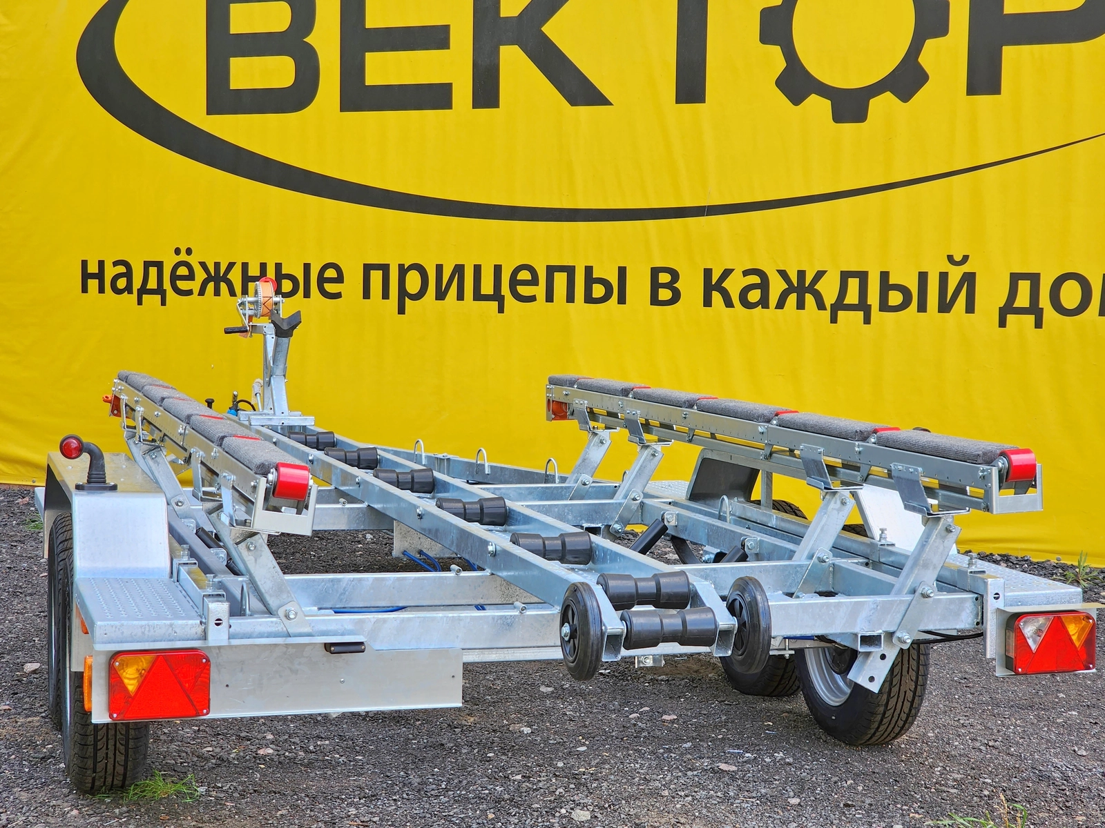 Рама, оси прицепа полностью оцинкованы методом горячего цинкования. Крылья выполнены из оцинкованной стали. Прицеп двухосный, с тормозом наката. Подвеска колес (R14) на четырёх полуэллиптических рессорах с гидравлическими амортизаторами. Оборудован выдвигающимися на 1000 мм. штангами с фонарями. Сцепное устройство шарового типа, под шар D 50 мм. Полная масса 2400 кг.