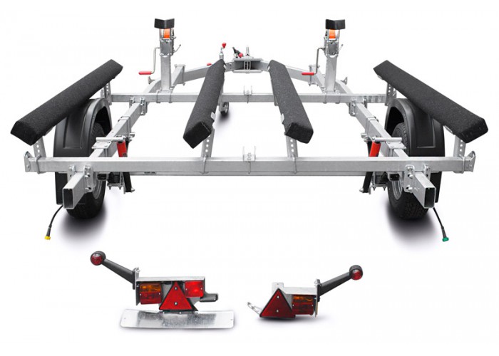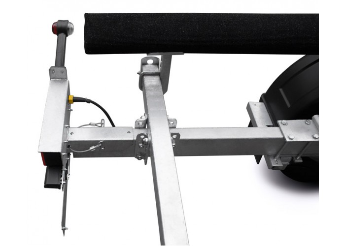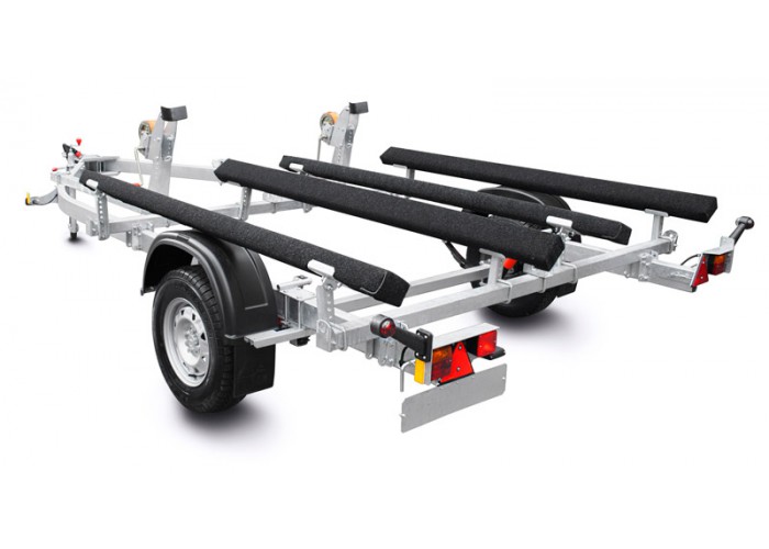 ● Передвижные ложементы могут быть установлены в любой точке поперечен рамы, в т. ч. и над крыльями прицепа, имеют регулируемый угол наклона и регулируемую высоту. Это позволяет установить их в наиболее удобное положение, избежать давления на продольные реданы, а также расположить технику максимально низко, тем самым обеспечить устойчивость прицепа при движении и осуществлять спуск судна на воду меньшей глубине. При перевозках и хранении судна на прицепе ложементы позволяют равномерно распределить вес техники и уменьшить давление на корпус судна.