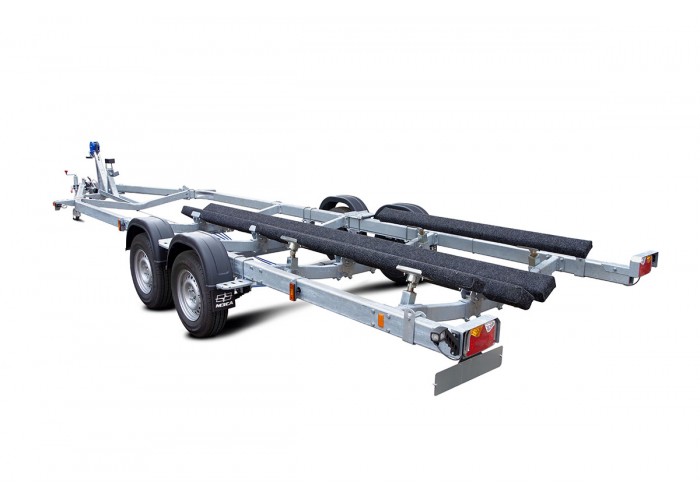 ● Ложементы могут быть установлены в любой точке поперечин рамы, имеют регулируемый угол наклона и регулируемую высоту. Это позволяет произвести наиболее точную регулировку, избежать давления на продольные реданы, а также расположить технику максимально низко, тем самым обеспечить устойчивость прицепа при движении и осуществлять спуск судна на воду при меньшей глубине. При перевозках и хранении судна на прицепе ложементы позволяют равномерно распределить вес и уменьшить давление на корпус судна.