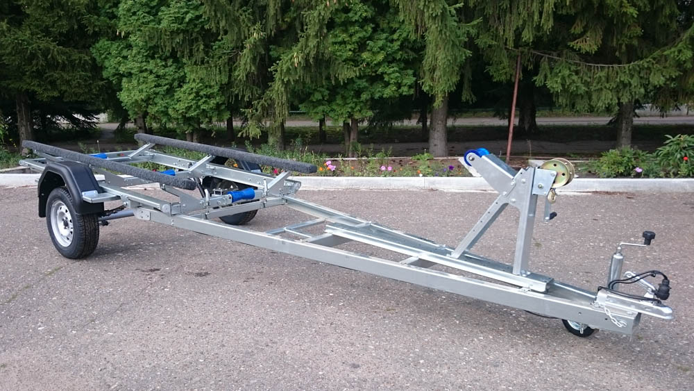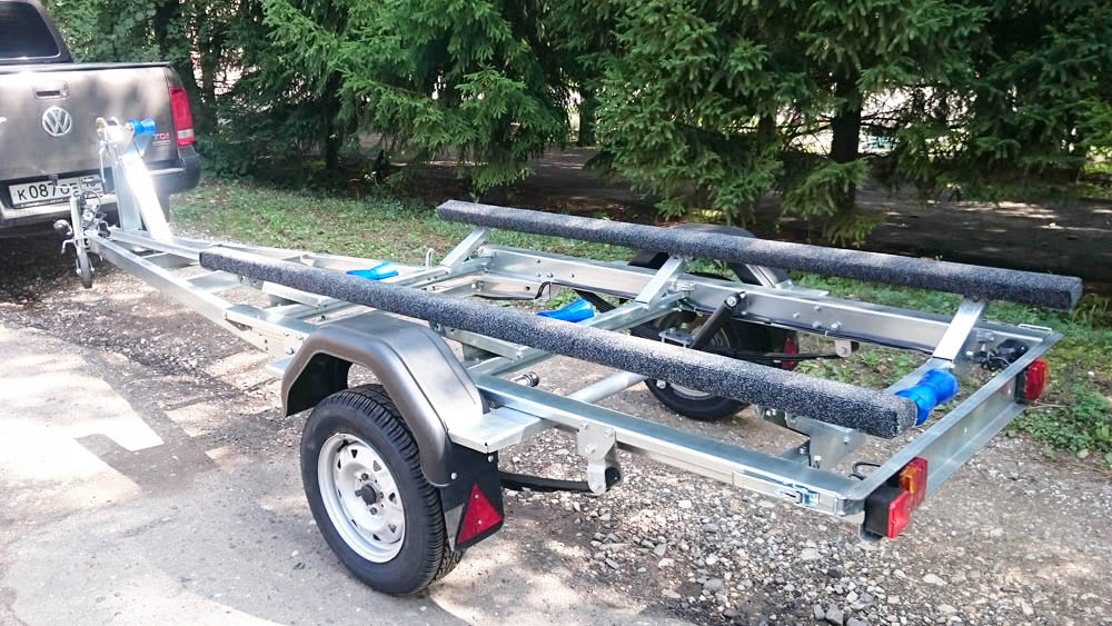Одноосный прицеп предназначен для перевозки гидроциклов, катеров и ПВХ –лодок. Изготовлен прицеп из оцинкованного листа толщиной 3 мм. Детали изготовлены с применением лазерной технологии раскроя. Для обеспечения правильной развесовки носовой упор имеет регулировку по длине и высоте прицепа. Широкий диапазон регулировки ложементов позволяет перевозить суда с различным углом килеватости. Рессорная подвеска с резиновым подрессорником, обеспечивает плавность хода, как в груженом, так и порожнем состоянии. Особенностью прицепа является функция опрокидывания грузовой платформы и трехопорные ложементы. Опрокидывание платформы позволяет осуществлять погрузку/разгрузку судна на неподготовленном берегу водоема без необходимости заезда глубоко в воду. Благодаря возможности регулировки каждой опоры по отдельности ложементы можно адаптировать под различные обводы корпуса судна. Задняя поперечина с установленными на ней фонарями съемная, что предотвращает попадания воды в фонари и замыкание светотехники.