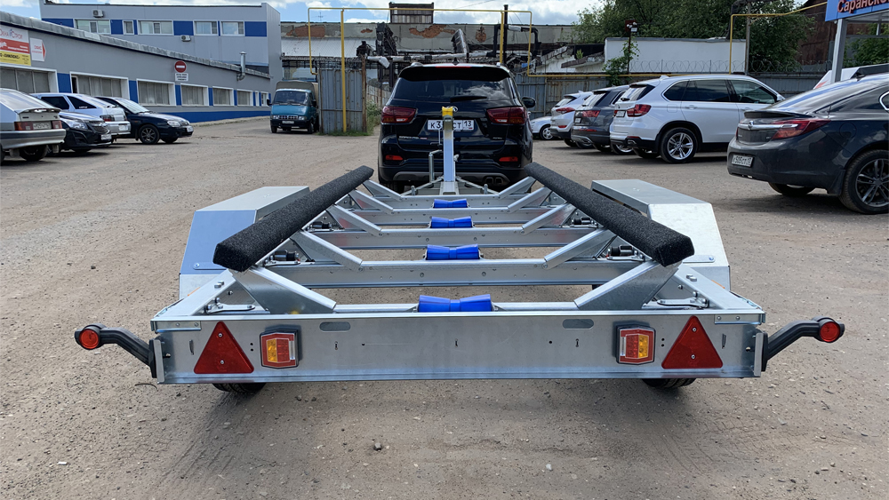 Двухосный прицеп предназначен для перевозки гидроциклов, катеров и ПВХ –лодок. Изготовлен прицеп из оцинкованного листа толщиной 3 мм. Детали изготовлены с применением лазерной технологии раскроя. Для обеспечения правильной развесовки носовой упор имеет регулировку по длине и высоте прицепа. Широкий диапазон регулировки ложементов позволяет перевозить суда с различным углом килеватости. Рессорная подвеска двухосная на 4-х рессорах с гидравлическими амортизаторами. Благодаря возможности регулировки каждой опоры по отдельности ложементы можно адаптировать под различные обводы корпуса судна. Задняя поперечина с установленными на ней фонарями съемная, что предотвращает попадания воды в фонари и замыкание светотехники.