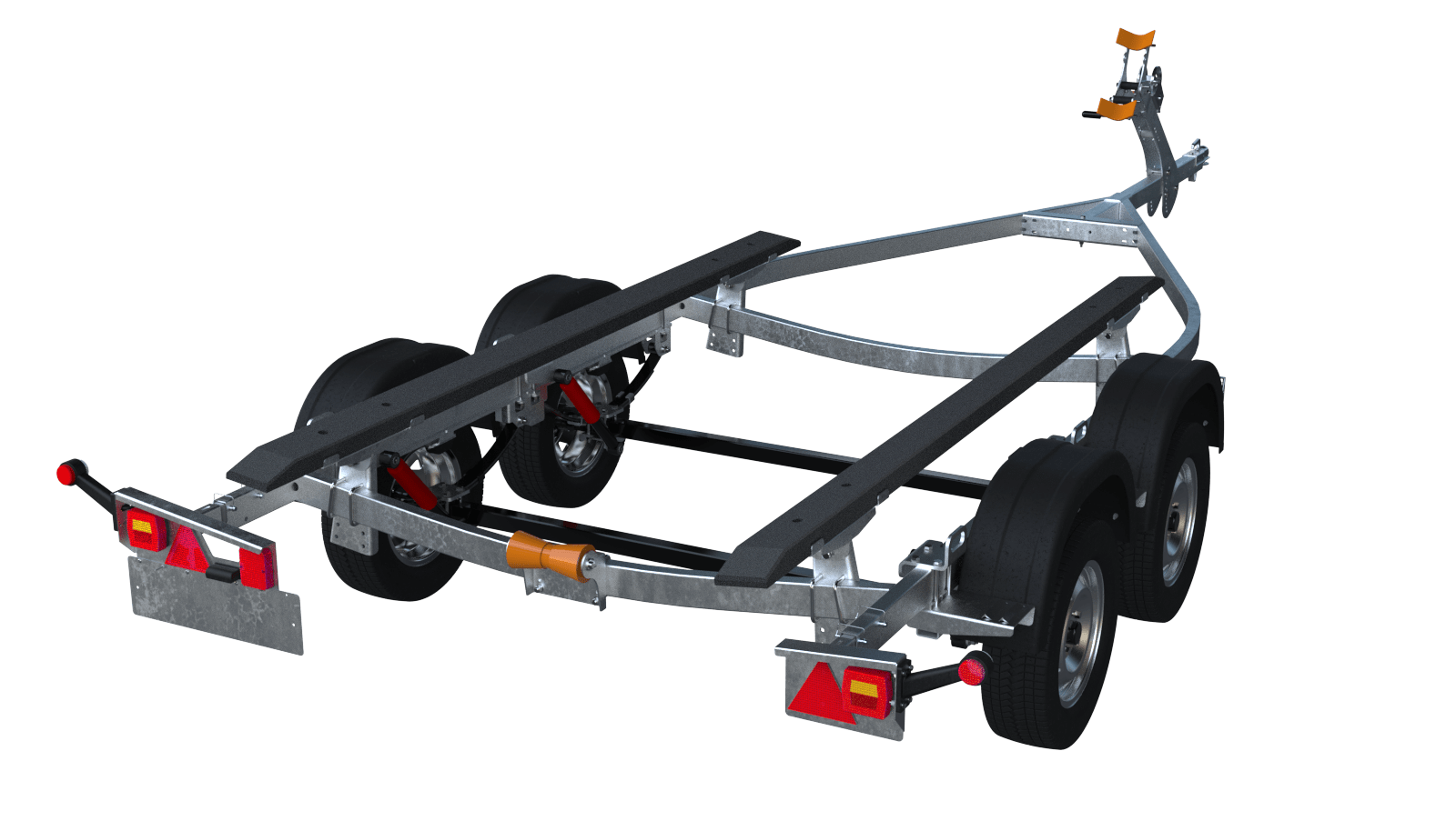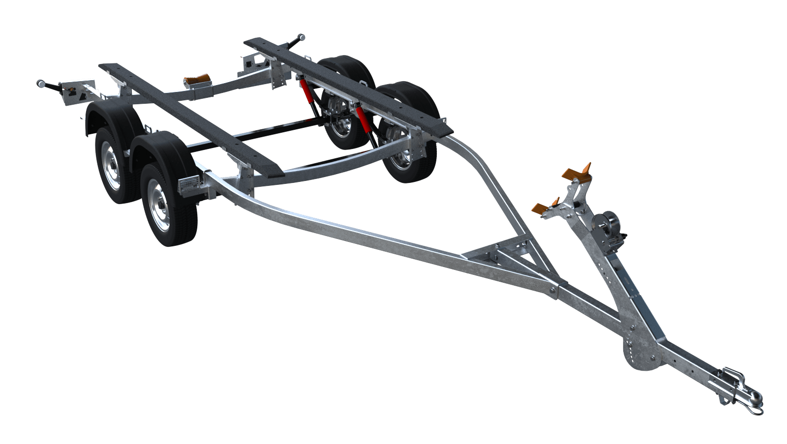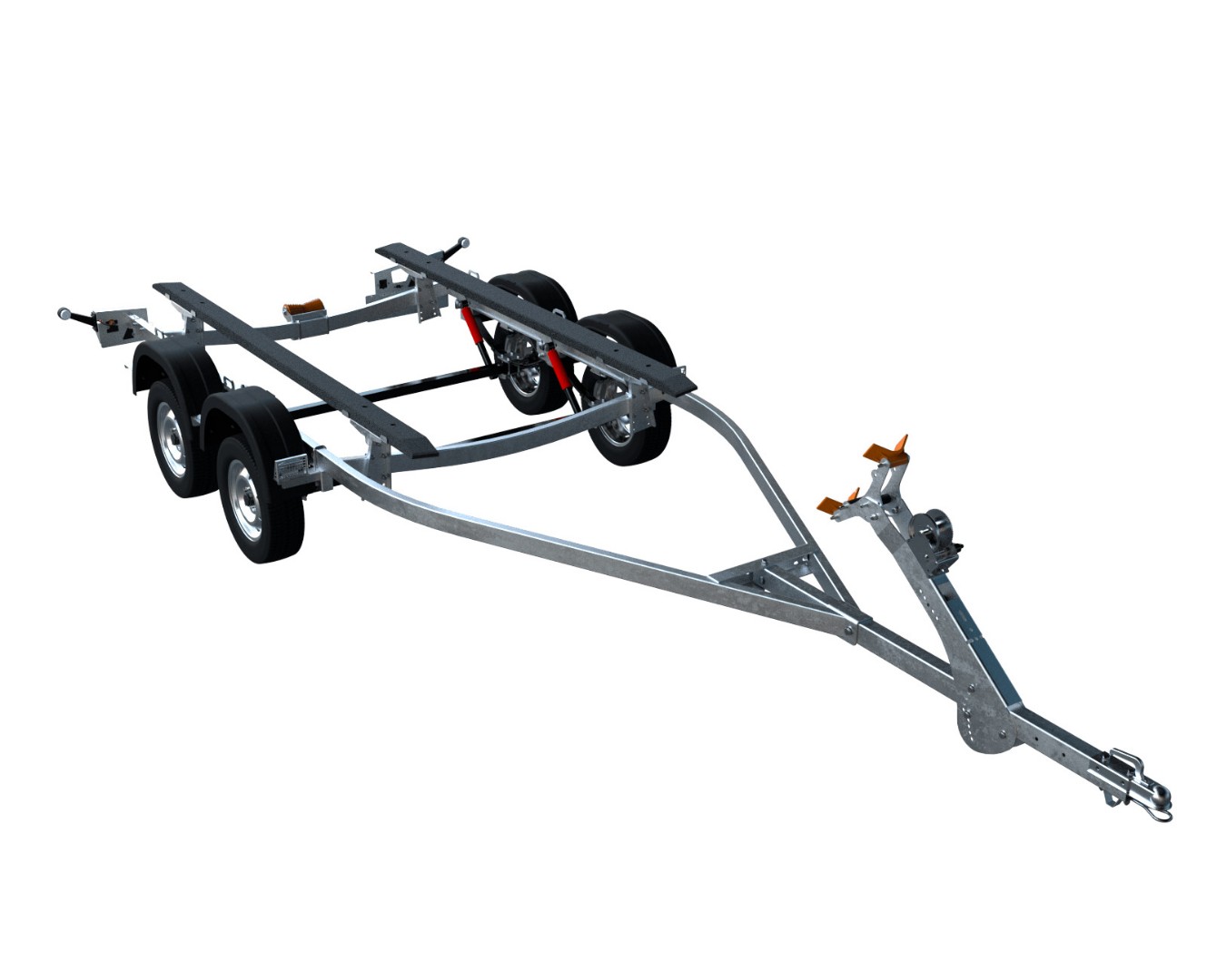Труба дышла 80х60 крепится к раме на болтовых соединениях. Регулируемый носовой упор с лебёдкой имеет несколько вариантов настройки положения и наклона. Ложементы могут менять положение относительно поперечин рамы, имеют регулируемый угол наклона и регулируемую высоту.