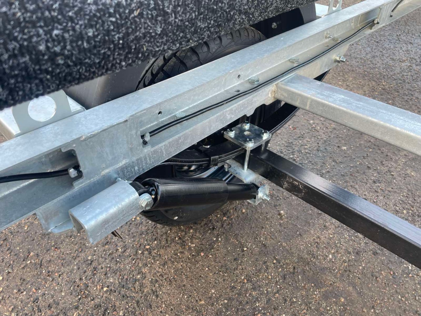 Рессорно-амортизаторная подвеска состоит из оцинкованного жесткосваренного подрамника, двух четырехлистовых рессор со скользящим концом российского производства и двух амортизаторов и оси 50*50 мм.
