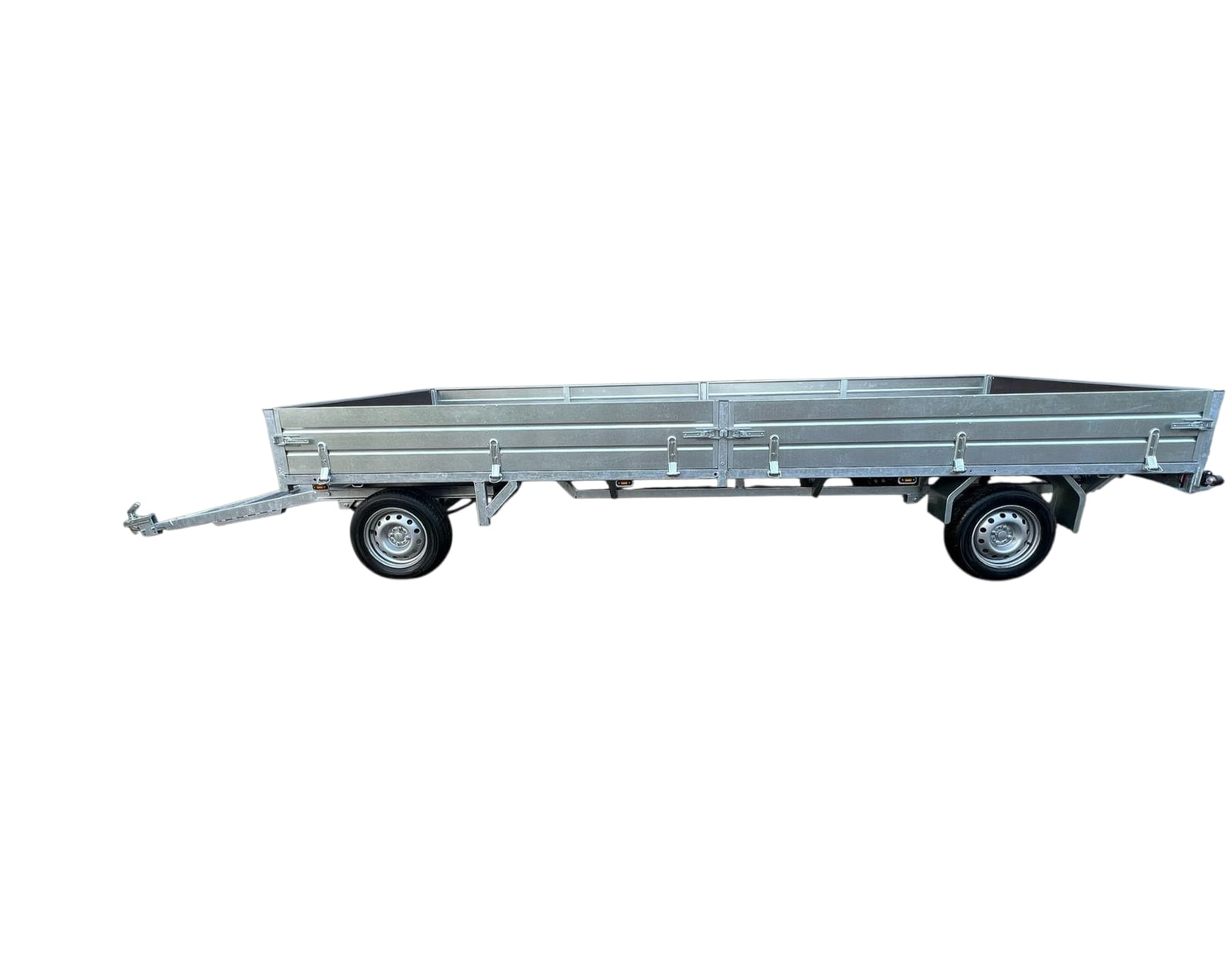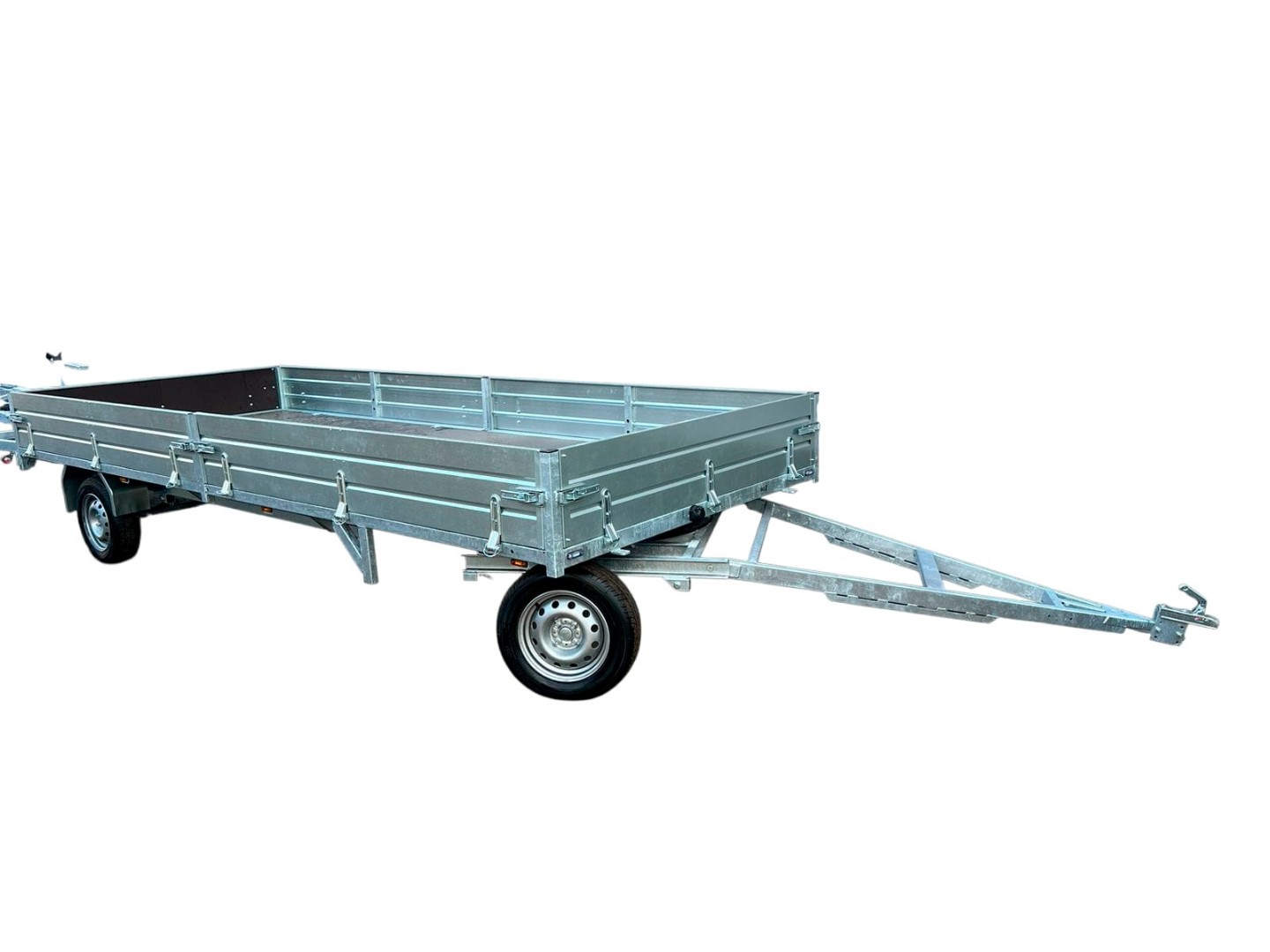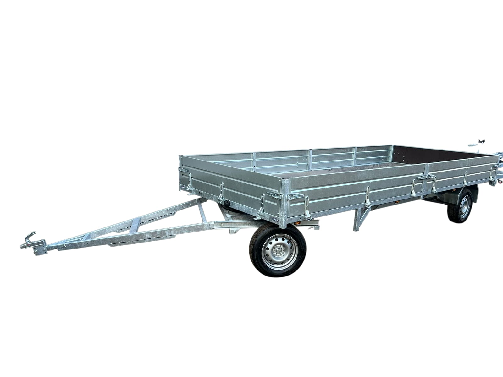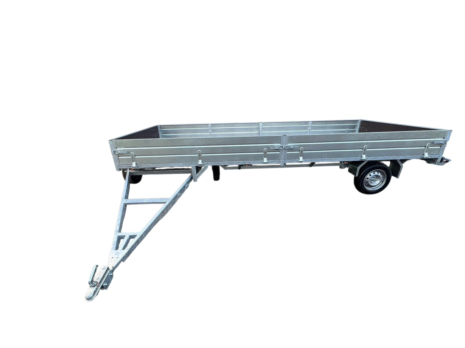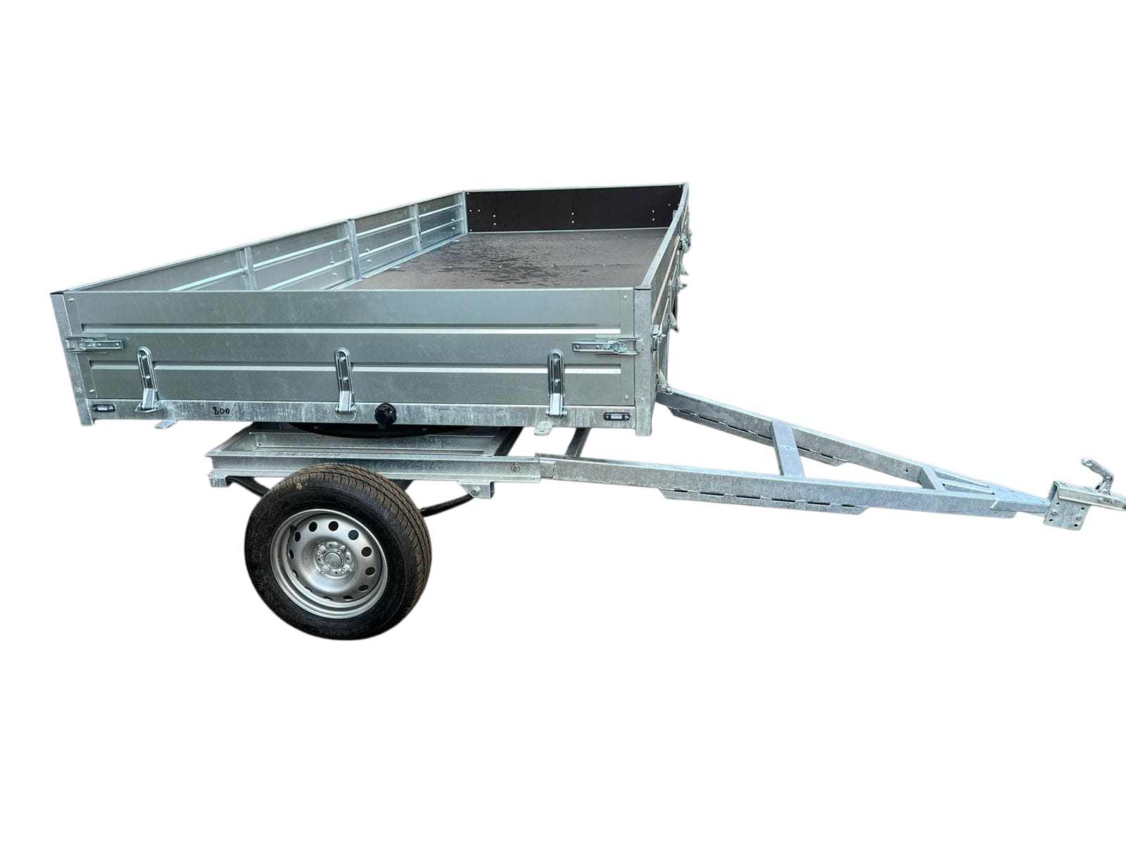 Рама прицепа сварная из труб и профилей, оцинкованная "горячим способом". Все борта - откидные с возможность быстрого съёма. Возможность быстрого демонтажа бортов позволяет превратить бортовой прицеп в прицеп-платформу. Традиционно в стандарте : опорное колесо, кронштейн запасного колеса, крылья из оцинкованного металла.